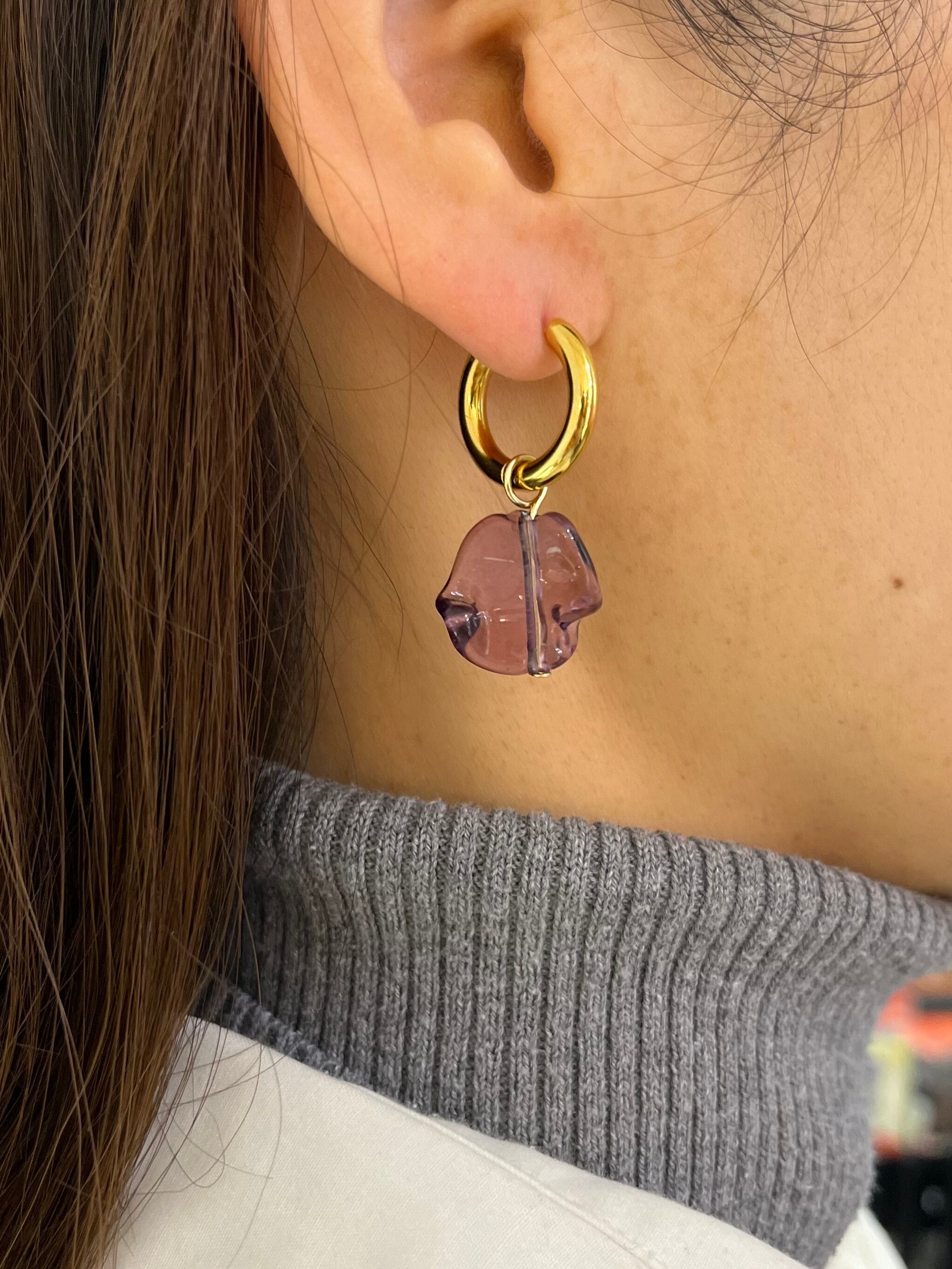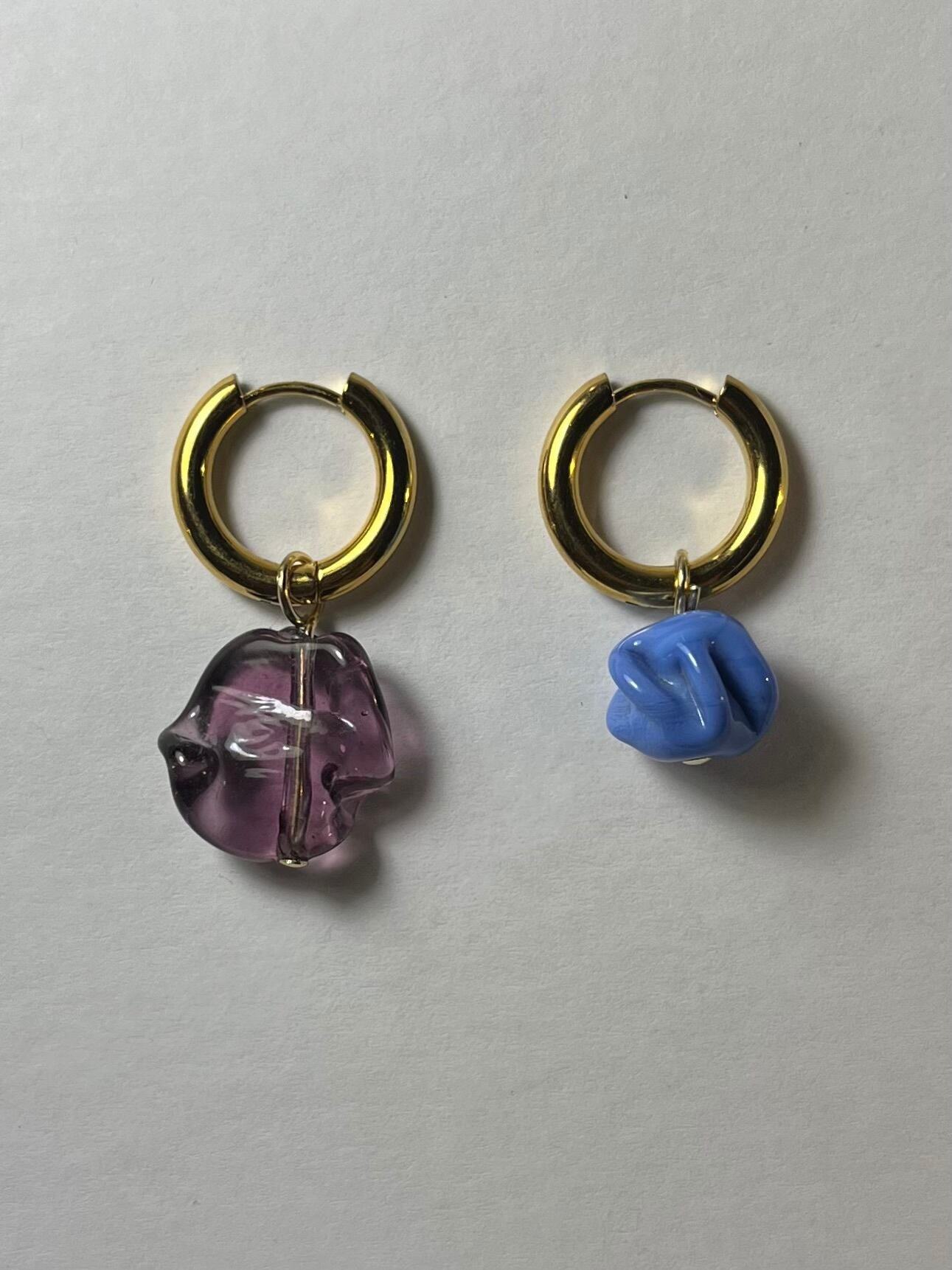 紫のフリルのようなフォルムの薄いガラスとお花のつぼみのようにかわいいフォルムのブルーガラスの2つをペアリング
