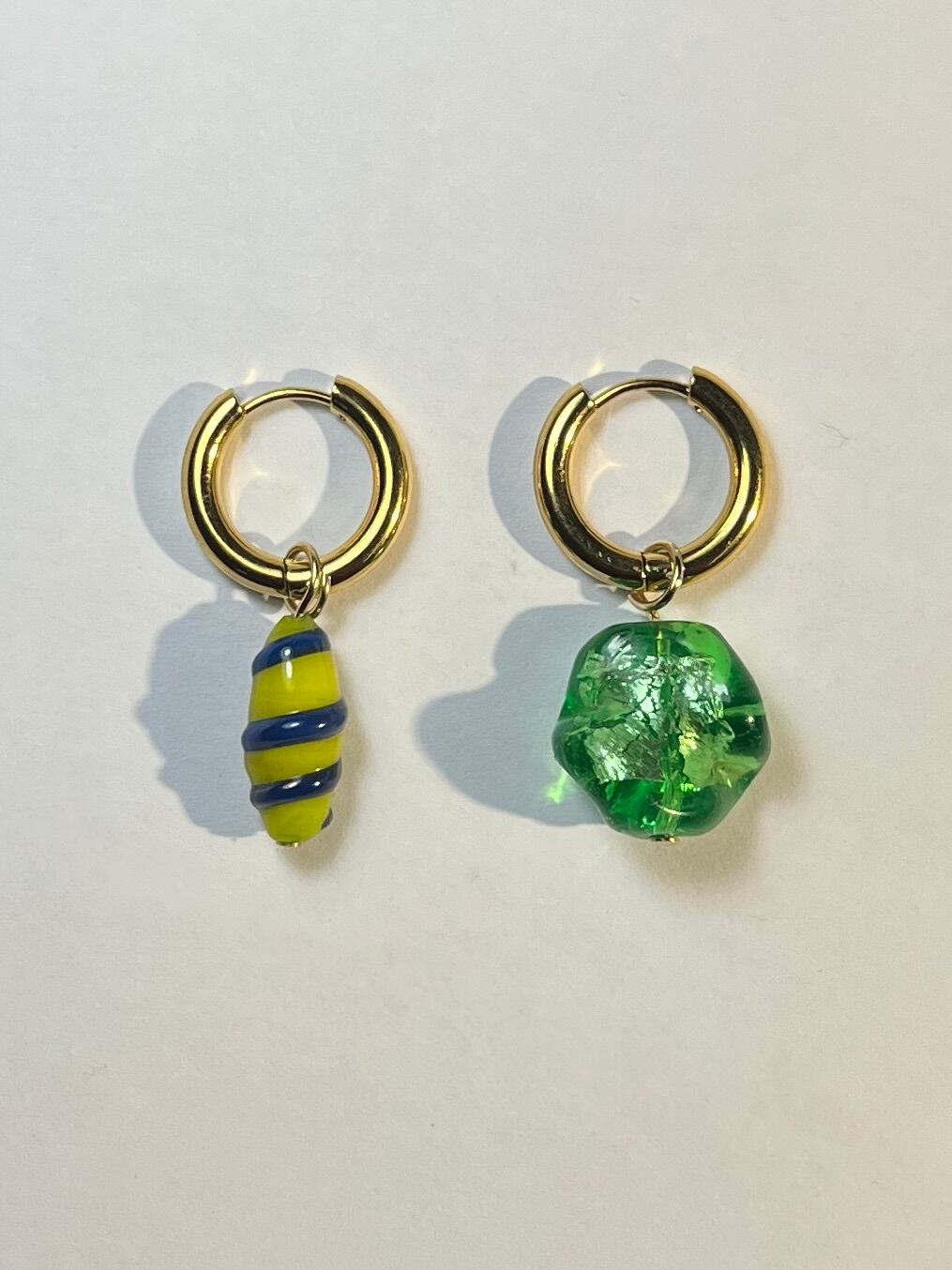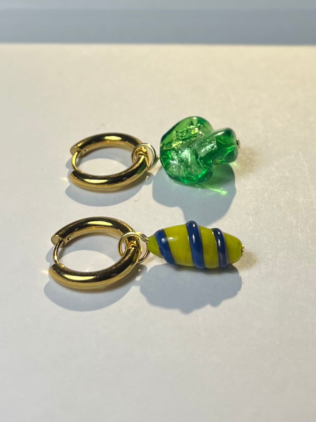 イエローにネイビーのライン、キャンディのようなポップなガラスと、銀箔を閉じ込めた捻ったエメラルドグリーンのガラスの2つをペアリング